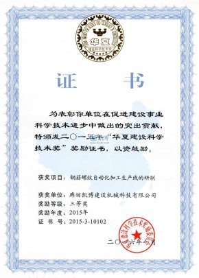 機械工業科學技術獎三等獎智能化鋼筋 部品生產成套設備研究與產業化開發